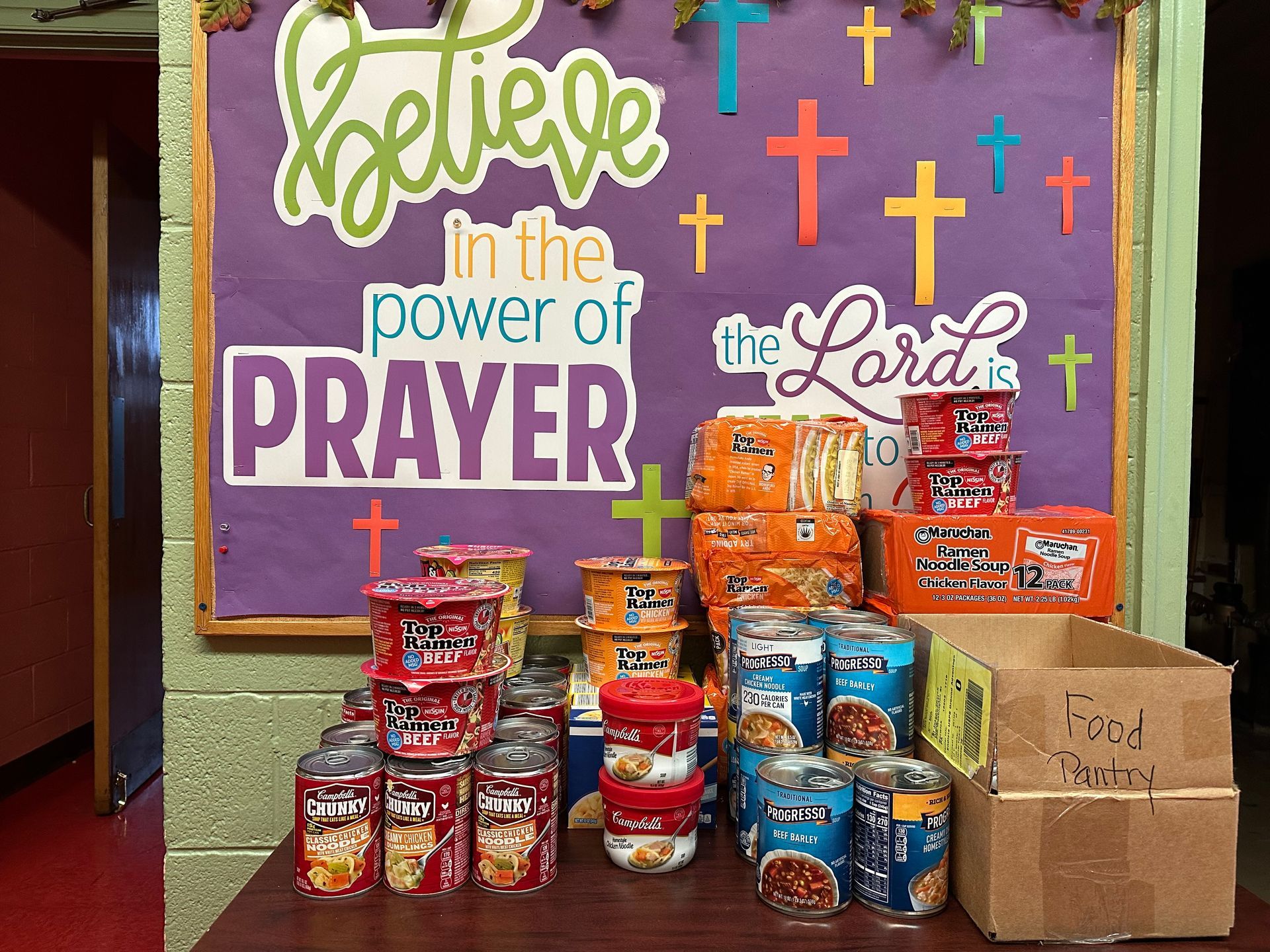 We are blessed to have teachers who donate their time to guide our students on their faith journey. Their leadership is teaching our students to care for the needy in our community. Our students are also wonderful; they have collected hundreds of hats, scarves, and gloves for the needy each year at Christmas time. New this year, they are collecting canned soups and Ramen for the local food pantries and shelters.